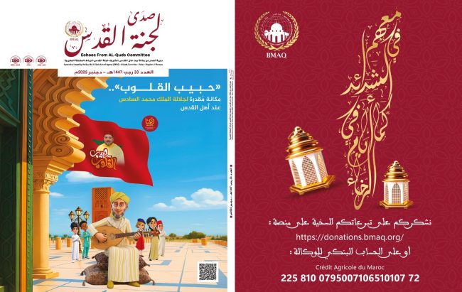 الرباط – أصدرت وكالة بيت مال القدس الشريف، مؤخرا، العدد الـ 33 من دورية “صدى لجنة القدس”، باللغتين العربية والإنجليزية. وخصص غلاف هذا العدد للاحتفاء بالمكانة الخاصة التي يحظى بها صاحب الجلالة الملك محمد السادس، رئيس لجنة القدس، لدى الأشقاء الفلسطينيين بصفة عامة، باعتباره قائدا للوحدة ورمزا للحرية والعدالة والسلام. وأعاد العدد الجديد التذكير بمضامين…